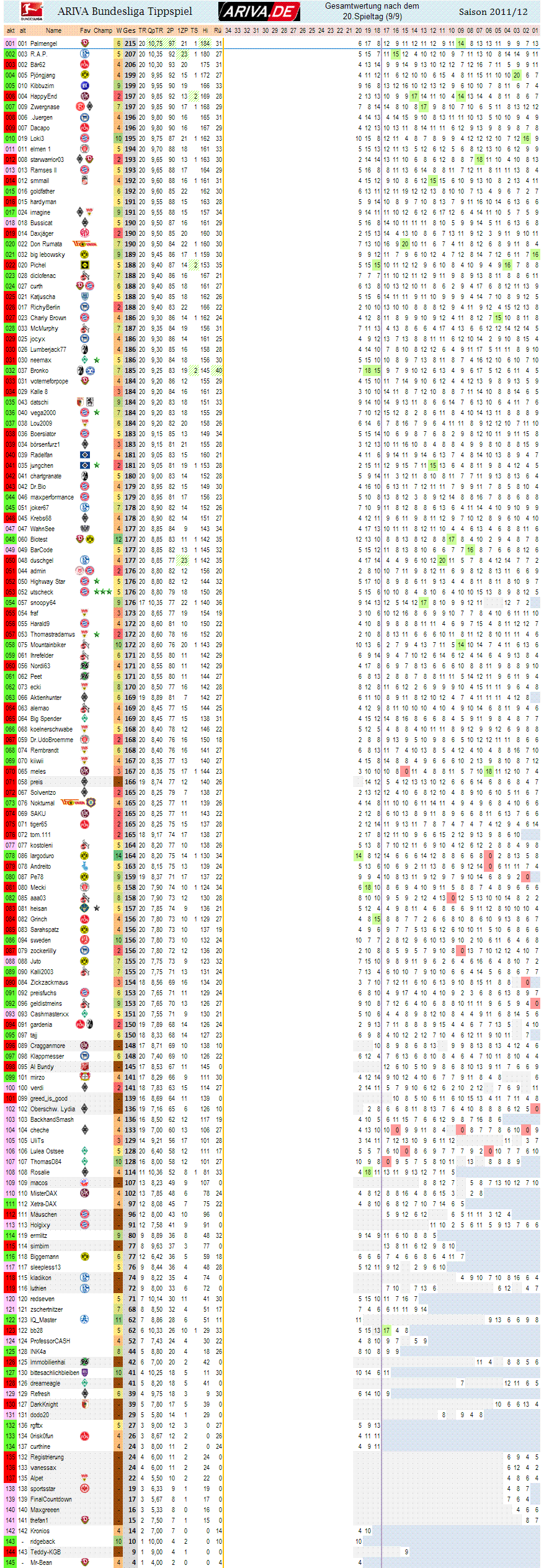 uuuund - es bleibt ja dank der Tageswertung und den Statistiken nicht verborgen - absoluter Saisonminusrekord, was die Punkteausbeute angeht!! Im Schnitt wurden gerade mal 5,30 Punkte p. Tipper eingefahren... Insgesamt 647 Punkte nur!! Und das, obwohl der Teilnahmerekórd mit 122 Tipper/innen eingestellt wurde!!