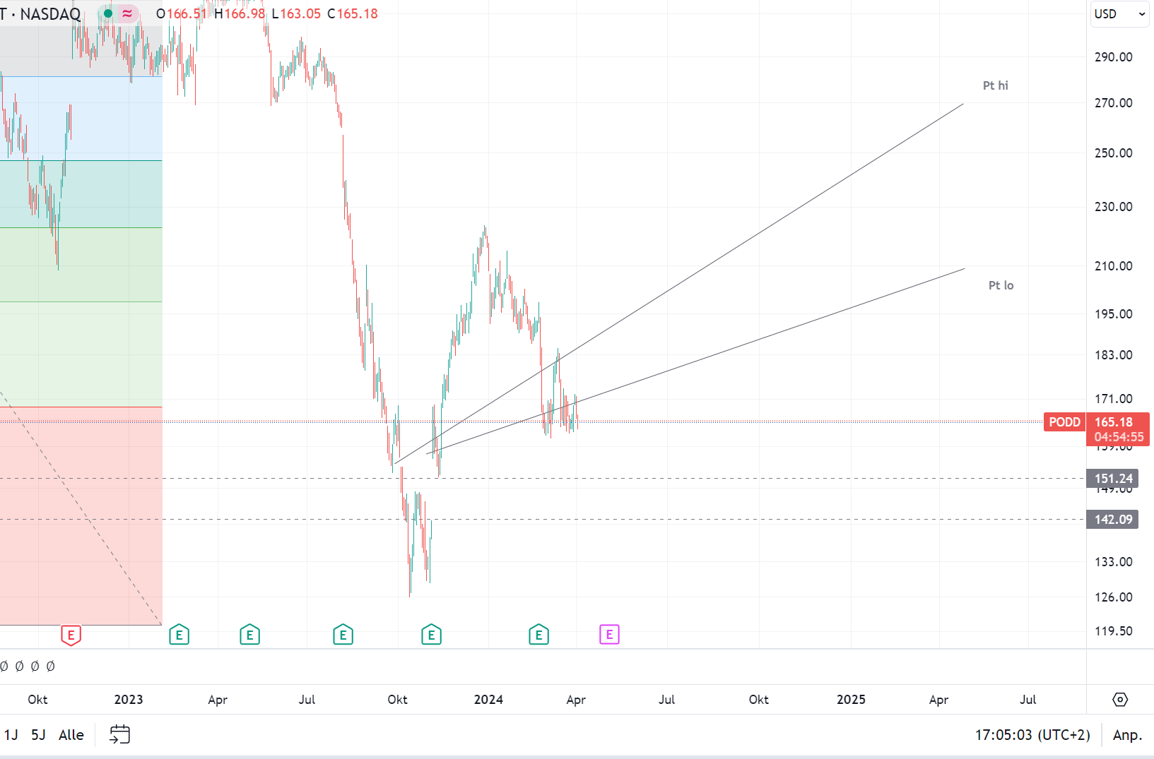 Aktuell würde bei mir ein Wiedereinstieg zwischen 120 – 140.-USD getriggert, hängt aber davon ab, ob und wie er sich im untersten Retrace verhalten will.