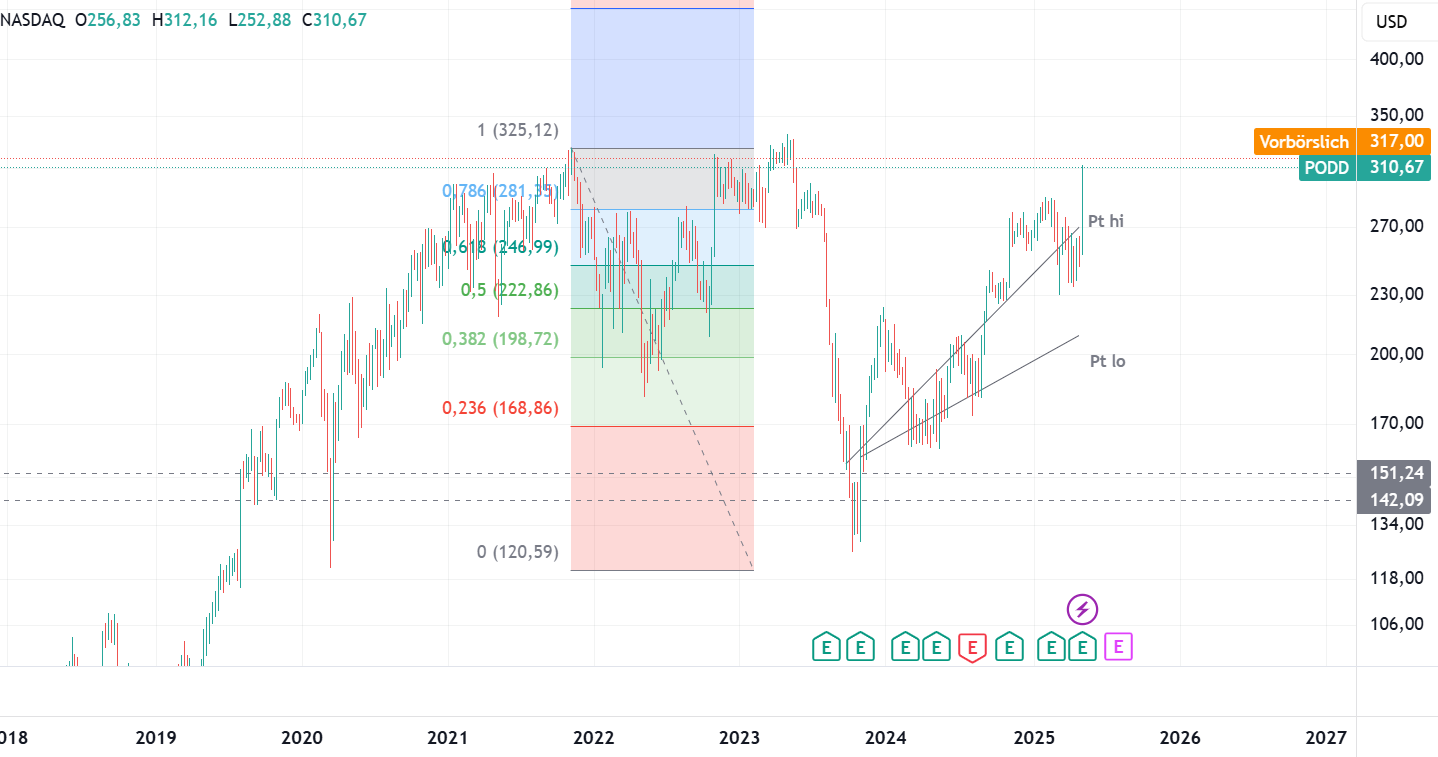 in den Charts von Dexcom, tandem diabetes und von Insulet liegt eine aufsteigende, mögliche Abprallkante exakt 44 - 45% unter den heutigen Tageskursen.