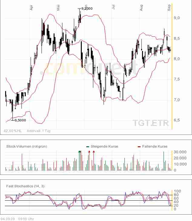 Die Aktie hat nach dem jüngsten Kurssprung sauber korrigiert und notiert weiterhin über der 38-Tage-Linie. Aus charttechnischer Sicht ist eine Fortsetzung des steilen Aufwärtstrends daher wahrscheinlich. Die heutige Meldung könnte dafür schon der Auslöser sein. Auch fundamental stehen die Ampeln auf Grün: Das laufende KGV liegt bei 10 und 2010 ist mit weiterem Wachstum zu rechnen. Das Kursziel beträgt 7,00 Euro, der Stoppkurs 3,90 Euro.
