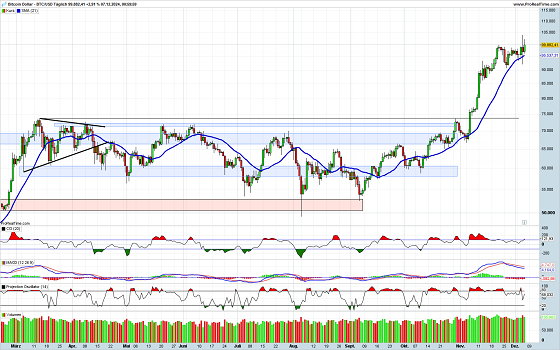 In der vergangenen Woche konnte die Kryptowährung einige Male die magische Grenze von 100.000 USD überwinden. Auf Schlusskursbasis ist dies dann am Samstag gelungen. Somit ist das Ziel der großen runden Zahl erreicht worden und die ersten Stimmen werden laut, dass das nächste Ziel bei einer Million liegt. Ob und wann dieses Ziel erreicht werden kann ist offen und soll an dieser Stelle auch nicht diskutiert werden. Es hat sich in der Historie des Bitcoins aber gezeigt, dass nach dem Erreichen der Marken bei denen eine „1“ vorne steht, meist eine nicht unwesentliche Gegenbewegung eingetreten ist. Somit sollte in den kommenden Tagen und Wochen nicht zu sorglos mit dem Bitcoin umgegangen werden, auch wenn noch einige weiteren Kursavancen eintreten sollten.