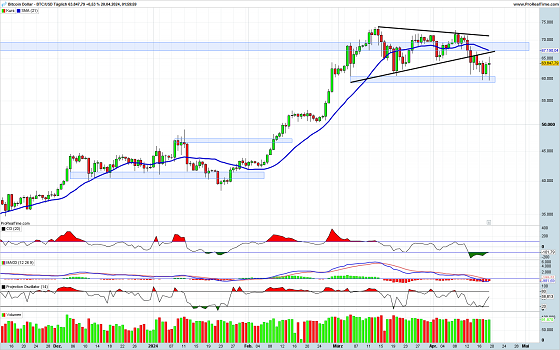 Das Halving beim Bitcoin ist am Samstag erfolgt. Es war natürlich nicht damit zu rechnen, dass dieses Ereignis, welches alle vier Jahre vorkommt, einen sofortigen Einfluss auf die Kursfindung hat. Dieser Einfluss dürfte sich erst in einigen Wochen einstellen. Aktuell ist die Kryptowährung aus dem Dreieck nach unten ausgebrochen und hat damit zunächst Abwärtspotenzial eröffnet. Allerdings ist keine Abwärtsdynamik aufgetreten, und die Unterstützungszone um 60.000 USD hat gehalten. Es ist nicht auszuschließen, dass sich der Bitcoin auf dem aktuellen Niveau zunächst stabilisiert.