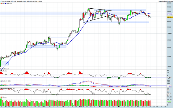 Die Kryptowährung ist in den letzten Tagen weiter abgebröckelt und läuft so langsam Richtung Unterstützungszone. Diese befindet sich im Bereich von 60.000 USD und könnte bereits in den kommenden Tagen erreicht werden. Die Indikatoren dürften sich noch weiter im überverkauften Bereich aufhalten. Technisch ändert sich nichts, solange der Seitwärtsbereich nicht verlassen wird.