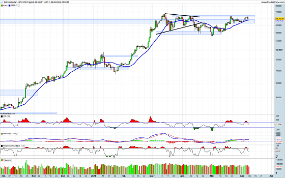 Die Kryptowährung ist zuletzt wieder an der 70.000er-Marke gescheitert. Dabei sah es einige Tage danach aus, als könne jetzt der Ausbruch nach oben geschafft werden. Je öfters nun ein Scheitern attestiert werden muss, um so massiver wird der Widerstand werden. Da die Indikatoren gerade erst Verkaufssignale generiert haben, dürfte ein nächster Angriff auf den Widerstand zunächst auf sich warten lassen.