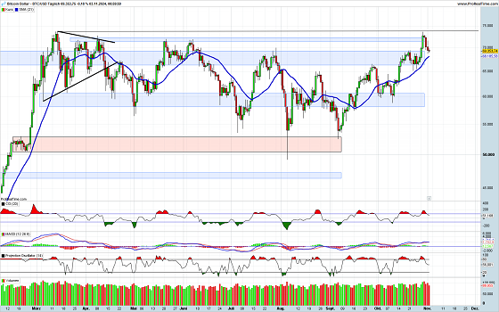 Zunächst ist der Bitcoin an der Widerstandszone im Bereich von 69.000 USD gescheitert. Der folgende Ausbruch konnte aber noch nicht dazu führen, dass das bisherige Rekordhoch überschritten wurde. Dies sollte aber keinen Widerstand darstellen, da es sich nur um eine Marke und nicht um mehrere Anlaufpunkte handelt. Die nun erfolgte Gegenbewegung stellt für sich genommen kein Problem dar, wenn darauf kein neuer Abwärtstrend entsteht. Die aktuellen Verkaufssignale bei den Indikatoren dürften bald abgearbeitet sein. Somit sollte es nur noch eine Frage der Zeit sein, bis ein neuer Rekord erreicht wird.