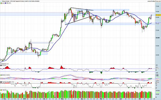 Vor zwei Wochen sah es noch so aus, als gerate die Kryptowährung zunehmend unter Druck und startet einen neuen Abwärtstrend. Diese Befürchtung hatte sich mit einer Hammerformation am tiefsten Punkt der letzten Monate aber nach und nach in Luft aufgelöst. Inzwischen notiert der Bitcoin wieder im Bereich einer Widerstandzone und hat nun gute Chancen, weiterzulaufen. Die Indikatoren befinden sich zwar im überkauften Bereich, haben aber auch in den vergangenen Monaten kaum für nachhaltige Rückgänge gesorgt. Somit steht in der kommenden Woche ein Angriff auf die Marke von 70.000 USD an.