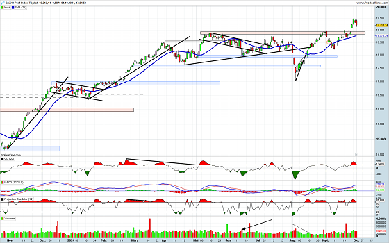 Der DAX hat den Ausbruch über die Widerstandszone geschafft. Nun dürfte nach der klassischen Technischen Analyse ein Pull-Back an die Ausbruchslinie folgen. Ein solches Verhalten passt dann auch zur aktuellen Indikatorenlage, die eine überkaufte Situation anzeigt und kurz vor Verkaufssignalen steht. Allerdings ist derzeit nicht mit einer Ausweitung der Gegenbewegung zu rechnen. Die Saisonalität spricht in zweierlei Hinsicht für einen weiterhin freundlichen Markt. Zum einen hat mit dem neuen Monat die Jahresschlussrallye begonnen. Zum anderen weist die Statistik eine ganz besondere Zyklik auf. 13 Tage nach einer Zinssenkung gibt es eine hohe statistische Wahrscheinlichkeit, dass der DAX für ca. fünf Handelstage zulegen kann. Solche Statistiken dürfen selbstverständlich nicht überbewertet werden, da Sonderereignisse, wie zum Beispiel Kriege, hier keine Berücksichtigung finden können.