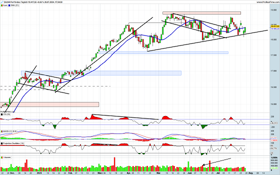 Der DAX konnte zuletzt den Aufwärtstrend halten, was aber nur eine Nebensächlichkeit darstellt. Viel wichtiger ist aus technischer Sicht, dass das letzte Tief von Mitte Juni nicht unterschritten wurde. Zudem konnte der deutsche Leitindex am Donnerstag eine Intraday-Stimmungswende vollziehen. Für einen Hammer ist der Kerzenkörper zu groß, was der positiven Trendwende nicht schadet. Am Freitag konnte dieser Trendwende bestätigt werden. Allerdings waren die Umsätze am Freitag recht gering, weshalb zum Wochenstart unbedingt eine Bestätigung erfolgen sollte. Die im neutralen Bereich notierenden Indikatoren helfen derzeit nicht weiter. Dem Wochenauftakt kommt also eine besondere Bedeutung zu.