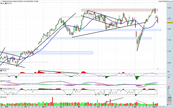 Jetzt ist es also doch so gekommen. Der DAX hatte im Bereich der alten Tops einen kleinen aber nicht zu übersehenden Hammer generiert. Dieser wurde am darauffolgenden Handelstag bestätigt. Zur Eröffnung am Folgetag keimte noch einmal ganz kurz die Hoffnung auf, dass der Hammer negiert werden könnte. Noch im Tagesverlauf des gleichen Tages wurde diese Hoffnung jedoch jäh zerstört. Mit einem Gap und einer weiteren sehr schwachen Entwicklung zum Wochenschluss, wurde die insgesamt schwache Wochenperformance abgeschlossen. Auffällig ist die insgesamt kaum anziehende Umsatztätigkeit. Dies deutet darauf hin, dass es sich bislang noch nicht um eine Ausverkaufssituation gehandelt hat. Auch wenn die Indikatoren Verkaufssignale generiert haben, sollte zunächst noch von einer Korrekturbewegung auf den jüngsten, nahezu korrekturlosen, Aufwärtstrend gesprochen werden. Dieser kann allerdings noch bis in den Bereich der 18.000er-Marke führen. Von einer übergeordneten Trendwende sollte aktuell aber noch nicht ausgegangen werden.
