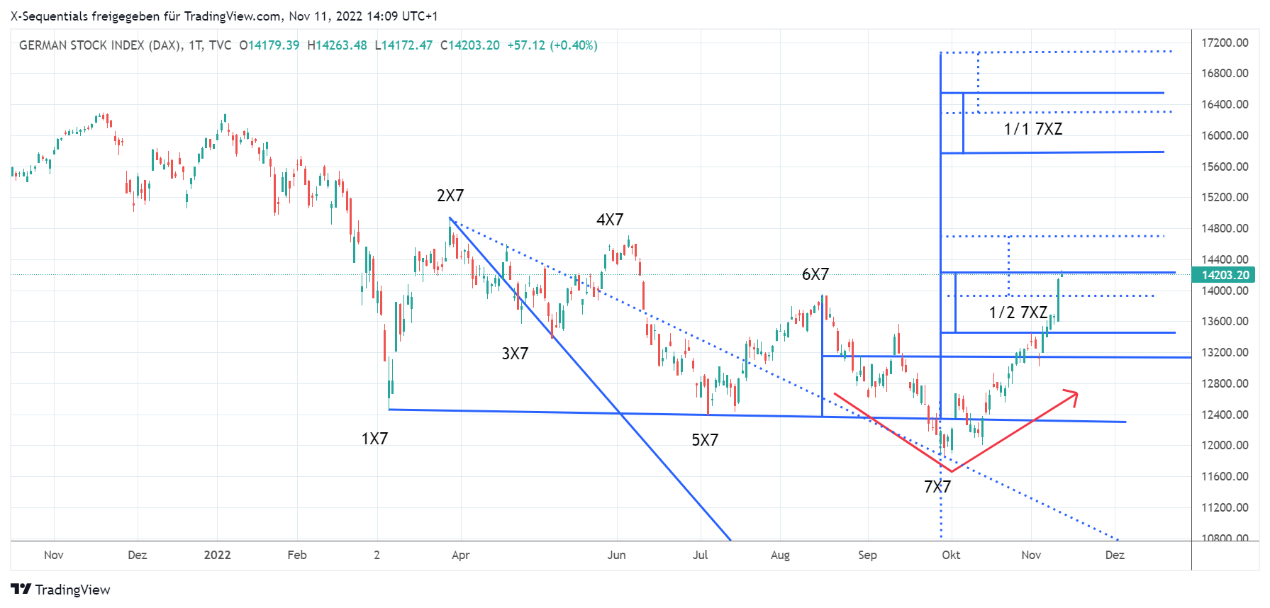 In der 45. KW. 2022 wurde bei einem Schlusskursstand von 13459.86 Punkten darauf hingewiesen, dass der DAX Index ein positives, bullishes X-Sequentials X7 Kursmuster ausgebildet hat.