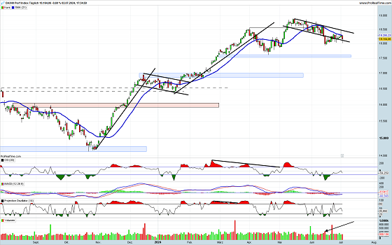 „Den Abwärtstrend nach unten verlassen und anschließend wieder zurückerobert“. So kann mit kurzen Worten beschrieben werden, was in den letzten beiden Wochen beim DAX passiert ist. Der heutige Handelstag zeigt zudem, dass die Marktteilnehmer zwar unsicher sind, ein weiteres Abdriften nach unten aber unbedingt verhindern wollen. Dies bedeutet nicht, dass das auch gelingt. Die Indikatoren befinden sich im neutralen Bereich, was keine Hilfe für ein Halten des Trends darstellt. Somit stellt sich die Frage, ob die Marktteilnehmer genügend Kraft aufbringen, einen Ausbruch nach oben zu generieren. Sollte dieser geschafft werden, dürfte der Trendkanal doch als trendbestätigend bezeichnet werden. Ein weiterer Ausbruch, der nicht bestätigt wird, würde den Kanal als nicht mehr relevant entlarven.
