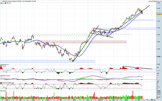 Natürlich hat der DAX die Trendlinie gebrochen und die Stimmungslage ist derzeit auch eher verhalten. Dies bedeutet aber nicht, dass jetzt eine Trendwende bevorsteht. Vielmehr ist es im Aufwärtstrend wichtig, dass es auch Korrekturen gibt, die trendbestätigend wirken. Die Indikatoren haben neue Divergenzen gebildet, die entsprechende Warnsignale darstellen. Auch wenn der heutige Handelstag erfreulich eröffnen dürfte, sollte die aktuell laufende Bewegung noch nicht beendet sein. Gleichwohl deutet die saisonale Historie noch auf weiter steigende Notierungen hin. Kurzfristig müssen die Anleger aber die Gegenbewegung noch aushalten können.