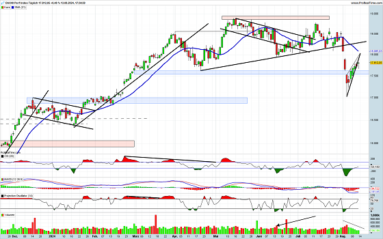 Nach dem Einbruch in der vorletzten Woche hat der DAX eine klassische Gegenbewegung vollzogen, die man als Korrektur auf die Abwärtsbewegung bezeichnen kann. Dabei hat sich eine Art Aufwärtskeil gebildet. Solche Keile werden nicht selten nach unten aufgelöst. Klassisch war auch der Verlauf der Umsatzzahlen. Diese waren in der Gegenbewegung rückläufig, was gezeigt hat, dass der Aufwärtstrend nicht von der Breite der Marktteilnehmer getragen wurde. Immerhin konnte gestern eine Intraday-Stimmungswende vollzogen werden, die ein wenig Hoffnung macht, was sich im bisherigen Verlauf des heutigen Handels bestätigt. Allerdings ist die saisonale Aussicht für die kommenden Wochen nicht besonders gut, weshalb kurzfristig nicht mit einem nachhaltigen Anstieg gerechnet werden sollte.