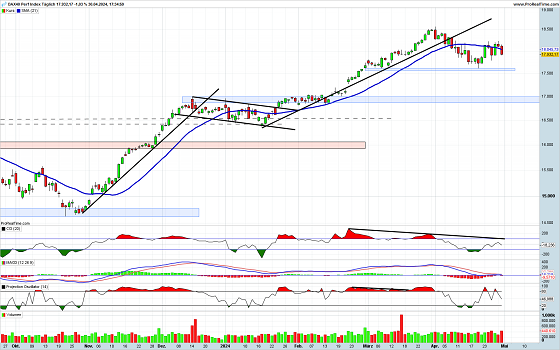 Mit dem Halten an der latenten Unterstützungszone und der dort generierten Intraday-Stimmungswende war die Hoffnung groß, dass der DAX nun einen neuen Angriff auf die jüngsten Topnotierungen startet. Diese wurde mit dem Wochenauftakt zunächst zerschlagen. Die Umsätze am gestrigen Handelstag zogen sichtbar an, was für eine gestiegene Abgabebereitschaft bei den Anlegern spricht. Die Indikatoren haben zum Teil bereits wieder Verkaufssignale generiert. Auch wenn kurzfristig die Unterstützungszone nicht in Gefahr sein sollte, ist der DAX derzeit in einer unsicheren Phase und dürfte in den kommenden Tagen weiter auf der Stelle treten.