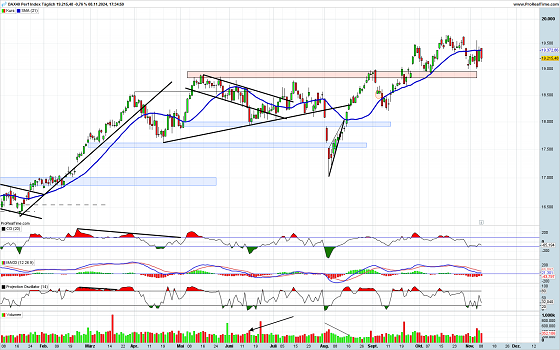 Die US-Wahl ist gelaufen und schon steht die nächste wichtige Wahl vor der Tür. Dieses Szenario haben sich die Anleger ganz anderes vorgestellt. Nicht auszudenken, wenn diese nun vorgezogene Bundestagswahl zu einer Hängepartie wird. Die Börse hasst Unsicherheit und es wäre für die weitere Marktentwicklung nicht zuträglich, wenn sich eine Neuausrichtung der Regierung tief ins neue Jahr ziehen würde. Was die Marktteilnehmer von der US-Wahl und der am gleichen Tag erfolgten Auflösung der Ampel-Regierung gehalten haben, wurde an diesem Tag eindrucksvoll vorgeführt. Zunächst ist der Markt, anders als vor acht Jahren, kräftig gestiegen. Im Tagesverlauf wurde dann immer mehr abgegeben und der Handelsschluss erfolgte im Bereich der alten Widerstandslinie. Die Ampelauflösung führte dann am Folgetag zu einer Korrekturbewegung nach oben. Als sich aber abzeichnete, dass sich eine Neuwahl noch hinziehen könnte, gab der Markt zum Wochenschluss wieder nach. In einer solchen Lage technische Signale zu finden, ist eher schwierig. Zudem befinden sich die Indikatoren im neutralen Bereich. Die Umsätze haben im Rahmen der turbulenten Tage zwar angezogen, sind inzwischen aber wieder rückläufig. Wichtig wird es nun werden, dass die Unterstützungszone gehalten wird. Wenn nun kurzfristig konstruktive Entscheidungen getroffen werden, könnte die Jahresschlussrallye wieder aufgenommen werden.