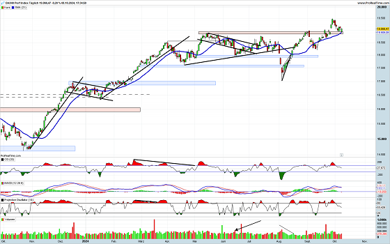 Der jüngste Rückgang des DAX an die Ausbruchszone ist zunächst als gesund für den Aufwärtstrend zu bezeichnen. Hier hat sich der deutsche Leitindex in den letzten Handelstagen halten können. Auch wenn die Unsicherheit am Markt derzeit noch vorherrscht, scheint der Bereich um 18.900 Punkte eine gute Unterstützung zu bieten. Die Indikatoren befinden sich im neutralen Bereich und dürften somit kaum eine Belastung darstellen. Ein Durchrutschen unter die Ausbruchszone sollte von der saisonalen Statistik verhindert werden können. Auch wenn die Jahresschlussrallye noch keine Fahrt aufgenommen hat, liegt in diesen Tagen sicher der Startpunkt.