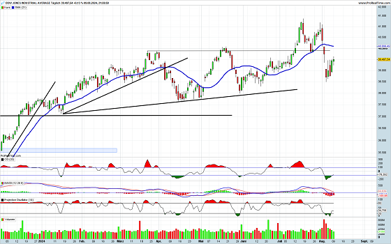 Der Dow Jones ist in der vorletzten Woche kräftig unter Druck geraten und konnte sich in der vergangenen Woche nur leicht erholen. Immerhin wurde das letzte Tief von Ende Mai nicht unterschritten. Die Kaufsignale bei den Indikatoren haben lediglich zu einer kleinen Korrekturbewegung nach oben geführt. Da die Umsätze mit den kräftigen Rückgängen signifikant angestiegen sind, könnte es sich hier um eine Art Ausverkaufssituation gehandelt haben. Entsprechend sind die Chancen beim Dow Jones gegeben, dass eine Rückeroberung der alten Unterstützungslinie erfolgen kann.