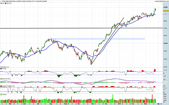 Die vergangene Woche war wieder von Kursgewinnen beim US-Leitindex geprägt. Die kräftigen Aufwärtsbewegungen in der zweiten Wochenhälfte zeigen dabei, dass weiterhin eine hohe Aufnahmebereitschaft bei den Marktteilnehmern zu beobachten ist. Die allgemeine Stimmung ist unverändert positiv. Der schwache Tag am Freitag ist lediglich als Korrekturbewegung im bestehenden Aufwärtstrend zu werten. Erst ein Unterschreiten der jüngsten Tiefs von Anfang März würde eine kurzfristige Änderung der Lage anzeigen. Die Indikatoren, die im überkauften Bereich notieren, sollten derzeit, wie in den vergangenen Monaten, kaum eine Belastung darstellen.