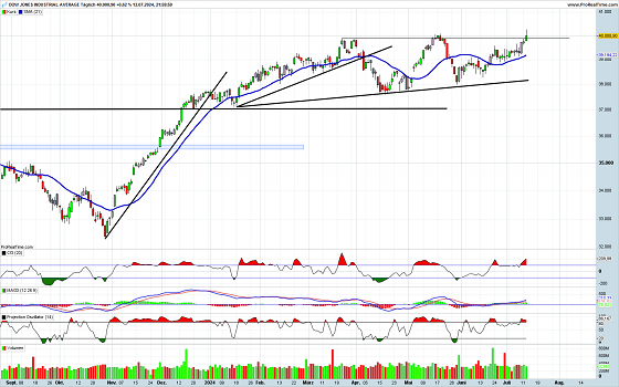 Zum Wochenschluss hat der US-Leitindex einen kräftigen Schub nach oben generiert. Nicht nur, dass er die große runde Marke von 40.000 überwunden hat, im Intraday-Handel konnte auch ein neues Rekordhoch erzielt werden. Allerdings wurde das Topniveau nicht gehalten und es wurden zum Handelsschluss wieder Gewinnmitnahmen vorgenommen. Die Formation gleicht einem Shooting-Star auch wenn der Kerzenkörper etwas zu groß geraten ist. Beim Ausbruch über die bisherigen Topnotierungen konnten die Umsätze nicht anziehen. Die Indikatoren bewegen sich im überkauften Bereich und stehen vor Verkaufssignalen. Somit sollte die neue Woche eher verhalten starten. Der übergeordnete Aufwärtstrend sollte allerdings nicht in Gefahr geraten.