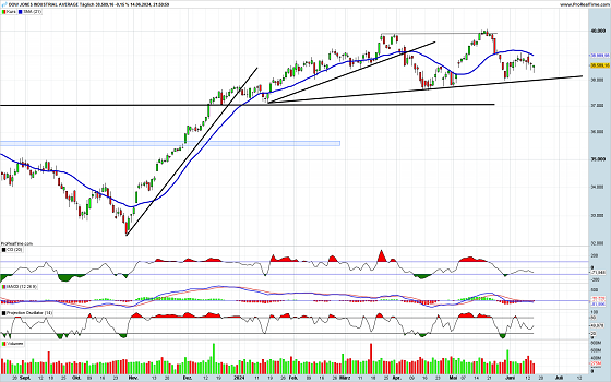 Die jüngste Anstiegsbewegung beim US-Leitindex wurde recht schnell wieder abgebrochen. Auffällig sind die recht kleinen Kerzenkörper und zum Teil recht langen Dochte und Schatten. Kleine Kerzenkörper stehen immer für Unsicherheit im Markt. Die Indikatoren, die sich im neutralen Bereich befinden, geben keine Hinweise auf die weitere Entwicklung. Zum Wochenschluss sind die Umsätze deutlich rückläufig gewesen und der Index hat sich von seinen Tagestiefs wieder mehr als erholt. Somit könnte bereits zum Wochenauftakt wieder eine freundlichere Stimmung vorherrschen.