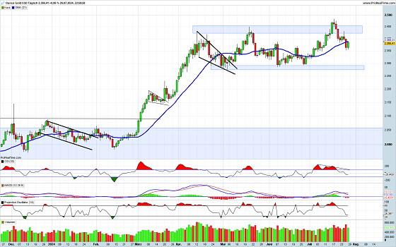 Gold kämpft nun wieder gegen ein weiteres Abrutschen. Im Bereich knapp unter 2.300 USD pro Unze hat sich eine Unterstützung etabliert, die derzeit zwar noch nicht im Fokus der Anleger steht, die aber in den kommenden Wochen wieder getestet werden könnte. Nach den Divergenzen bei den Indikatoren, war ein Abdriften zwar zu erwarten, ob diese Signale ausreichen, dass die Unterstützungszone getestet wird, ist fraglich. Ein sofortiges erneutes Anziehen in den Bereich des Widerstands sollte in der kommenden Woche aber auch nicht erwartet werden.