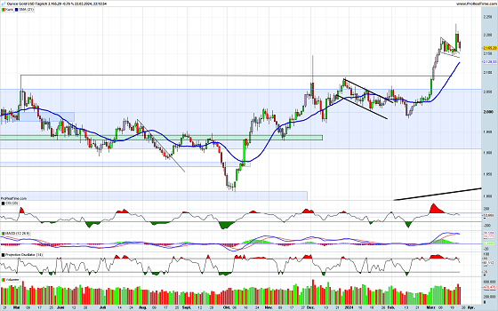 Vor wenigen Tagen deutete sich bei Gold ein Abwärtskeil an, der nach den Regeln der Kunst meistens nach oben aufgelöst werden müsste. Dies ist folgerichtig passiert und die Marke von 2.200 USD pro Unze wurde zeitweise deutlich überstiegen. Nach einem solch dynamischen Ausbruch ist es nicht verwunderlich, dass eine kurze Korrekturbewegung eintritt. Diese erfolgte im Einklang mit Verkaufssignalen bei den Indikatoren. Es ist nicht auszuschließen, dass sich diese Korrekturbewegung noch etwas ausweiten könnte. Da das letzte signifikante Tief inzwischen recht weit entfernt liegt, sollte nicht mit einer Trendwende gerechnet werden. Vielmehr dürfte der Goldpreis ggü. den Währungen weiter zulegen können.