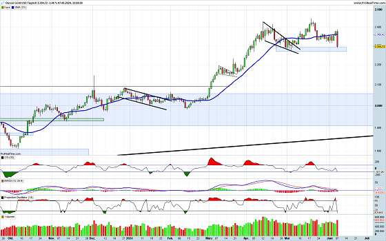 Die kurze Anstiegsbewegung zur Wochenmitte wurde am Freitag jäh beendet. Der Preis ist derart unter Druck geraten, dass sich Gold im Bereich der letzten Tiefs von Anfang Mai wiederfindet. Diese kleine Unterstützung sollte nun gehalten werden, damit sich die Lage nicht weiter eintrübt. Lediglich der MACD-Indikator könnte kurzfristig noch ein Kaufsignal generieren, ist aber an seiner Triggerlinie nach unten abgeprallt. Dies bedeutet, dass es noch einen weiteren Schub nach unten geben könnte. Noch ist nichts nachhaltig negatives passiert, allerdings trübt sich die Lage derzeit etwas ein.