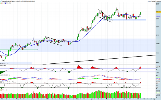 Nachdem zuvor mehrmals die Unterstützungszone erfolgreich getestet wurde, konnte sich Gold in den letzten Tagen deutlich von dieser Zone nach oben absetzen. Auch wenn die Indikatoren wieder im überkauften Bereich angekommen sind, besteht nun eine gute Chance auf ein Erreichen des jüngsten Rekordhochs. Dies würde nach der Dow-Theorie bedeuten, dass der Aufwärtstrend noch immer intakt ist. Die Chancen auf ein solches Szenario stehen recht gut.