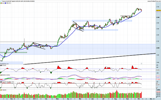 Die Korrekturbewegungen von Gold haben in den letzten Monaten immer mehr abgenommen und wurden meist als Seitwärtsbewegung vorgenommen. Für den Anleger ist dies natürlich viel stressfreier, als eine Korrektur, bei der mehrere Prozentpunkten verloren werden. Die Verkaufssignale bei den Indikatoren sind noch nicht abgearbeitet, was einen weiteren Rückgang bewirken könnte. Mit einem Einbruch, ist vor dem Hintergrund der aktuellen Krisen, gleichwohl nicht zu rechnen.