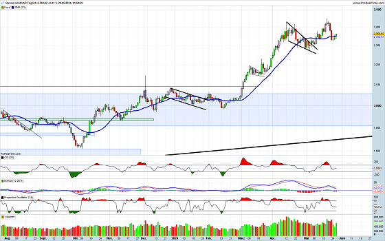 Gold verhält sich nach der Dow-Theorie vorschriftsmäßig. Zuletzt wurde ein neues Top generiert. Die anschließende Korrekturbewegung führte bislang nicht unter das letzte Tief. Somit darf der Aufwärtstrend als intakt bezeichnet werden. Die Indikatoren sind in den neutralen Bereich gefallen und geben damit keine Hinweise auf die weitere Entwicklung. Insgesamt dürfte sich die Lage bei Gold aber kaum wesentlich verändern.