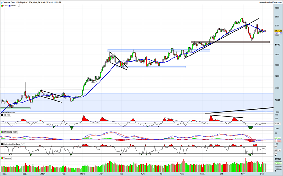 Nach den Gewinnen in diesem Jahr sollte es kaum verwundern, dass sich Gold etwas beruhigt hat. Der letzte dynamische Rückgang wurde von einer ebenso dynamischen, wenn auch nicht ganz so weit laufenden Gegenbewegung abgelöst. Inzwischen pendelt sich der Preis um die Marke von 2.600 ein und macht kaum noch Ausschläge in die eine oder andere Richtung. Entsprechend bewegen sich die Indikatoren im neutralen Bereich. Auch in der kommenden Woche sollte hier keine bedeutende Änderung eintreten.