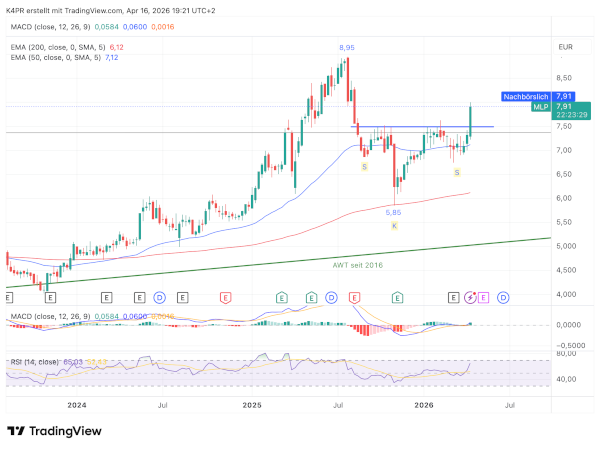 Dieses Muster hat sich seit August letzten Jahres aufgebaut und bewegte sich in einer Spanne zwischen 5,85 Euro und der sogenannten Nackenlinie bei rund 7,52 Euro. Genau diese Marke konnte die Aktie nun überschreiten. Das gilt als klares Zeichen dafür, dass der Aufwärtstrend an Fahrt aufnehmen könnte.