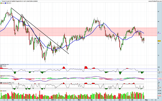 Öl befindet sich seit Anfang Juli in einem Abwärtstrend. In der vergangenen Woche hatte sich zwar eine Trendwende abgezeichnet, konnte diese Chance am Freitag aber nicht veredeln. Vielmehr wurde am Freitag eine große rote Kerze hinterlassen, die die Unsicherheit der Marktteilnehmer zeigt. Bei den Indikatoren sind widersprüchliche Signale zu erkennen, weshalb die Wahrscheinlichkeit eines weiteren Rückgangs etwas höher ist, als für einen Anstieg.