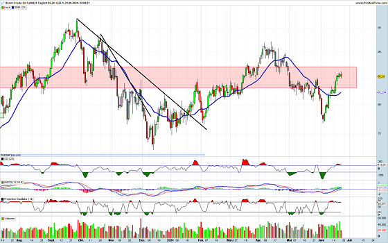 Der Öl-Preis hat es tatsächlich geschafft, in die Widerstandszone einzutauchen. In den letzten Handelstagen ist die Aufwärtsdynamik etwas verloren gegangen. Da die Anstiegsbewegung seit Anfang Juni recht steil verlaufen ist und keine nennenswerte Korrektur aufweist, könnte eine solche nun anstehen. Die im überkauften Bereich notierenden Indikatoren sprechen ebenfalls für eine, zumindest kurzfristige, Gegenbewegung.