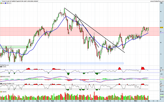 Der Öl-Preis hat einen neuen Anlauf genommen, nach oben auszubrechen. Zuletzt ist die Notierung an den oberen Bereich der Widerstandszone gestiegen. In der anstehenden Woche wird sich nun entscheiden, ob ein Ausbruch nach oben gelingt, oder ob es erneut zu einem Abprallen innerhalb der Zone kommt. Die Indikatoren notieren noch im neutralen Bereich und sollten damit einem Ausbruch nach oben nicht im Wege stehen.