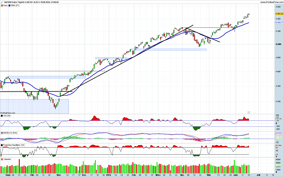Die stabilsten Trends sind die, die nur kleine Tagesbewegungen bei insgesamt wenig Volatilität aufweisen. Lediglich der April stellte eine bedeutendere Korrekturbewegung dar. Ansonsten steigt der US-Leitindex seit Ende Oktober letzten Jahres mit genau diesen Rahmenbedingungen. Entsprechend stellt sich die Lage beim US-Markt deutlich positiver dar, als beim DAX. Auch die Indikatoren, die sich im überkauften Bereich befinden, stören bei dieser Aufwärtsbewegung nicht. Somit kann der Trend noch weiter anhalten.