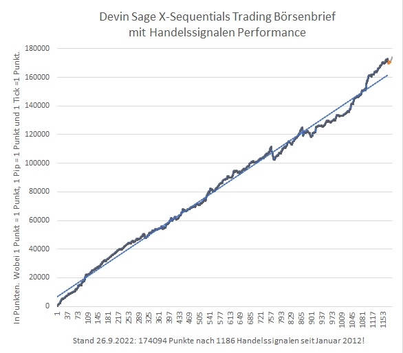 Das X-Sequentials Trading Börsenbrief mit Handelssignalen Musterdepot notiert am 26.9.2022 bei 174094 Punkten.